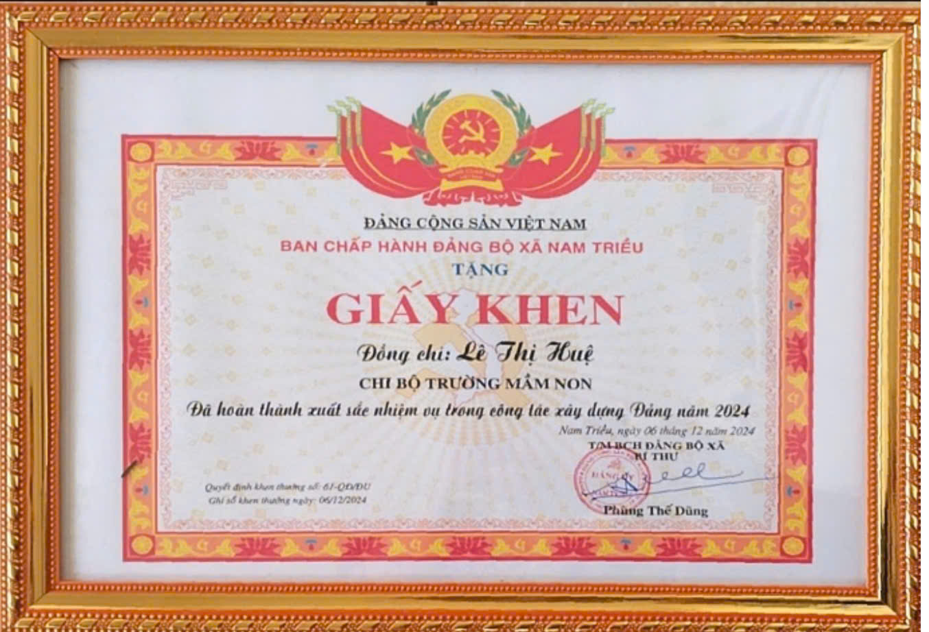 Cô xứng đáng là tấm gương sáng trong lòng đồng nghiệp, học sinh và phụ huynh. Với tất cả lòng yêu nghề, cô Lê Thị Huệ đã và đang viết tiếp những trang đẹp đẽ trong sự nghiệp "trồng người" của mình, góp phần làm rạng danh Trường Mầm non Nam Triều.