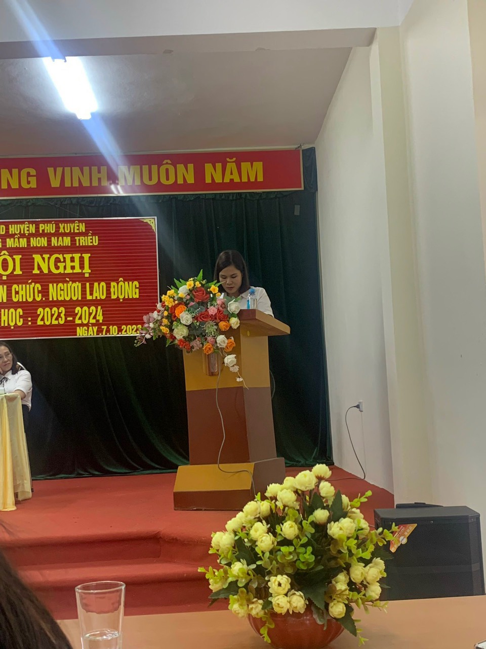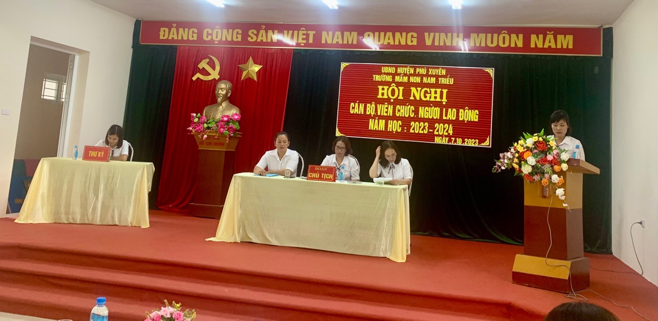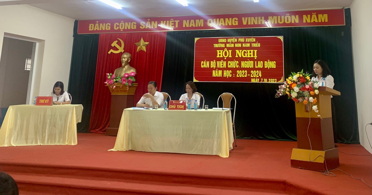 Thực hiện Công văn số 2410-LĐLĐ của Liên đoàn lao động huyện Phú Xuyên v/v tổ chức Hội nghị cán bộ công chức viên chức, người lao động năm học 2023 – 2024; Được sự cho phép của Phòng GD&ĐT huyện Phú Xuyên, trường Mầm non Nam Triều đã tổ chức Hội nghị cán bộ, công chức, viên chức năm học 2023-2024 nhằm tổng kết những kết quả đạt được trong năm học 2022-2023 và đưa ra phương hướng cho năm học mới 2023-2024.