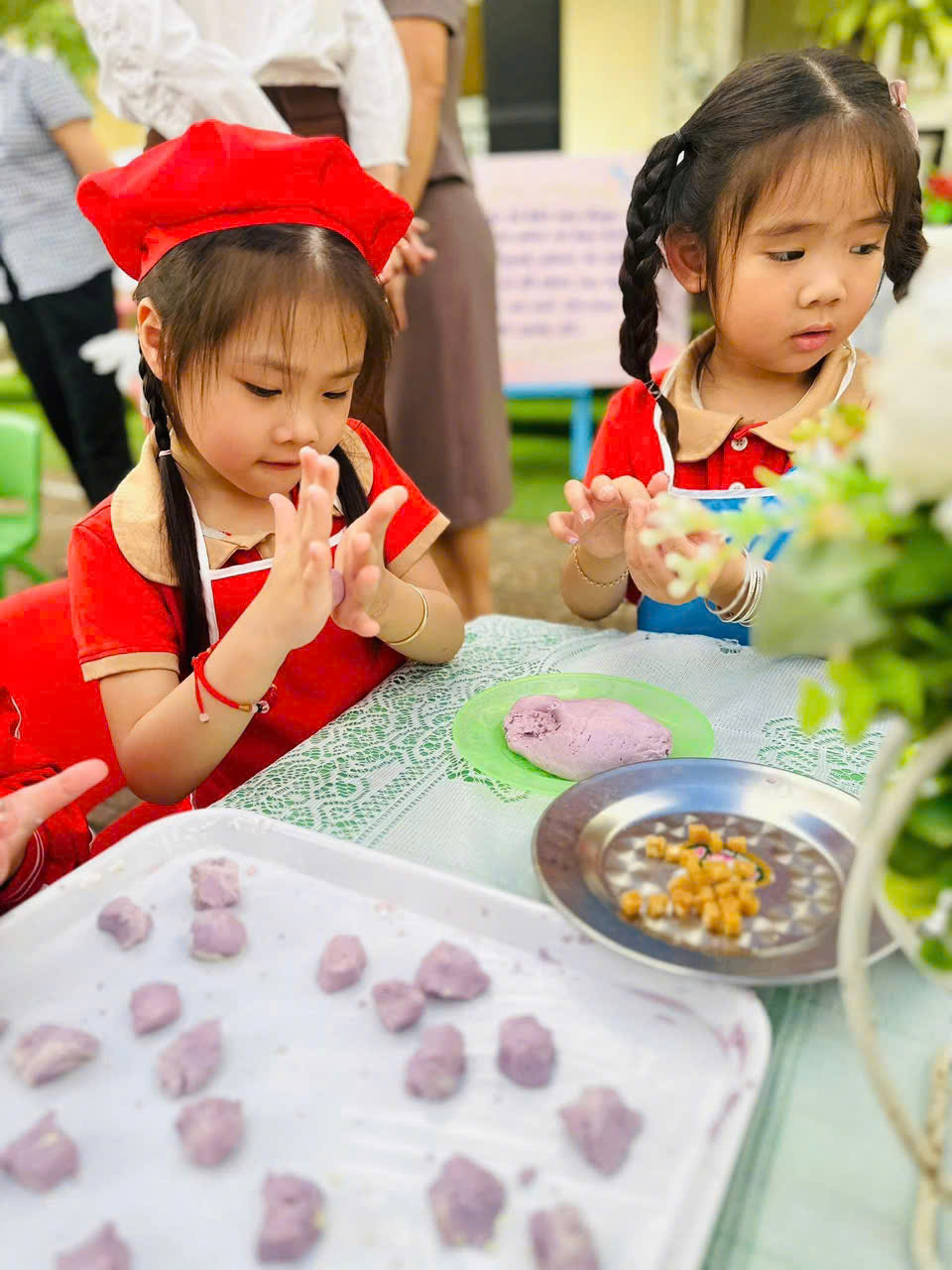 Để hoạt động trải nghiệm của các con thật sự ý nghĩa, các cô giáo đã chuẩn bị nguyên liệu hết sức chu đáo từ những viên đường phên làm nhân xinh xinh vuông vắn, những hạt vừng được rang thơm lừng đến những đĩa bột nếp nhiều màu sắc mềm dẻo như bột màu tím khi trộn bột nếp với nước lá Cẩm tím, bột màu xanh khi trộn bột nếp với nước lá dứa, lá cơm nếp...